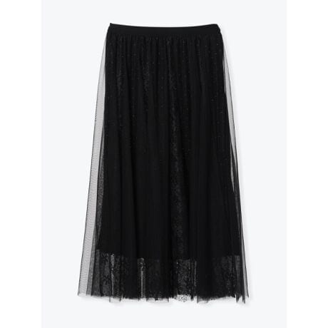 [型番:26550741703]チュール素材にストーンを散りばめた、華やかな印象のロングスカート。軽やかな透け感と繊細なディテールが、動きに合わせて上品に揺れます。コンパクトなトップスをインしてシルエットを引き立てたり、ショート丈トップスを合わせてバランスよくまとめる着こなしもおすすめ。存在感のあるスタイリングが楽しめる1着です。
