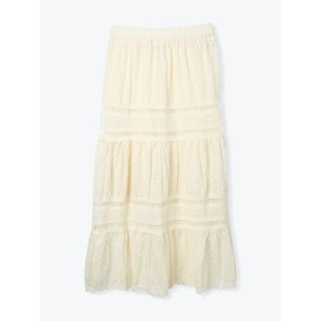 [型番:26410716615]繊細なレースと切り替えデザインで仕上げたロングスカート。段ごとに変化をつけた素材感が、動きに合わせて軽やかに揺れます。カジュアルなTシャツなどとのミックスした着こなしもおすすめです。足元はスニーカーやスポーツサンダルで外したスタイリングがおすすめです。Hare no hi/ハレノヒ