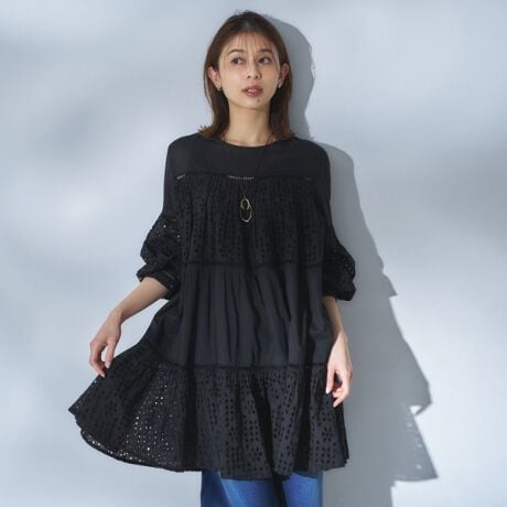 繊細なエンブロイダリーがやさしい華やかさを添える、ナチュラルな雰囲気のチュニックドレスです。