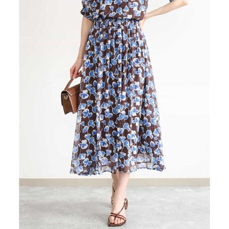 ふわっと軽やかなシルエットはトップスを選びません。同素材のブラウスとセットアップでワンピース見えの着こなしも楽しめます。ほかにもシンプルなトップスを合わせるとレディライクな雰囲気に。落ち着いた色味のプリントは派手過ぎずコーデに馴染むのが嬉しい。