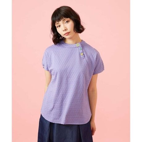 ドット柄が目を引く華やかなカットソー。短めの続き袖は丸みのあるフォルムで、女性らしい柔らかな印象を演出します。やや高めのネックデザインにより、首元の開きは控えめで上品な仕上がりに。襟元には幾何模様の刺繍を施し、配色ボタンがアクセントになった、ホコモモラらしいこだわりも魅力です。ボタンは襟元の一番上にのみ配置されています。一枚着としてはもちろん、インナーとしても活躍する着回し力の高いアイテム。ホコモモラならではのカラーリングで、コーディネートに彩りを添えてくれます。