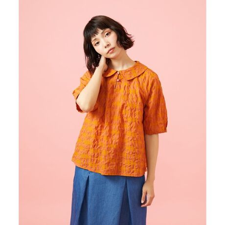 ワントーン配色の柄がかわいい半袖ブラウス。デイリー使いもしやすいプルオーバーデザインです。ラグランスリーブと前後に入ったタックがシルエット全体にゆとりをプラス。裾に向かって広がるAラインで暑い季節も快適にご着用いただけます。フラットカラーや丸みのある袖のデザインで、カジュアルながらも女性らしい印象のひと品に。フロントの涙開き部分の配色ボタンにも注目です。