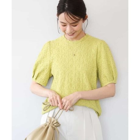 ポコポコとした素材が一枚でも着映えるカットソー。肩のギャザーと袖口のタックがふんわりとした袖の立体感をキープし、気になる二の腕も華やかにカバーする計算されたデザインです。ボリュームのあるボトムスとも相性抜群なスッキリとした身頃で、タックインしても、アウトでも腰回りがもたつきにくいのも嬉しい。