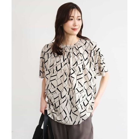 現代アートのような大きめの柄が目をひくブラウス。柄を引き立てるよう、衿ぐりはパイピング仕上げですっきりと、袖は長めのフレンチスリーブで一枚でも着こなしやすいデザインが特徴です。