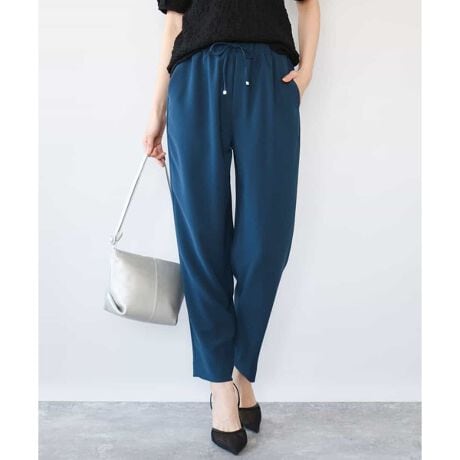 裾に向かって細く見えるきれいなラインが特徴のテーパードパンツ。ウエスト部分は総ゴム、共地リボンの先にゴールドパーツをあしらいデザインポイントに。