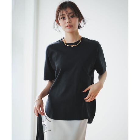 ■デザインこだわりぬいたフォルムで、美しいシルエットに。シンプル見えながら夏に嬉しい汗ジミ機能付きで、暑い日も汗ジミを気にせずオシャレを楽しめるTシャツです。袖に切り替えがないシームレスなデザインで、デコルテから肩にかけて綺麗に見せてくれます。裾は前後差のあるシャツテールで、合わせるボトムスを選びません。少し長めの袖丈で、二の腕もすっきり見えを叶えます。