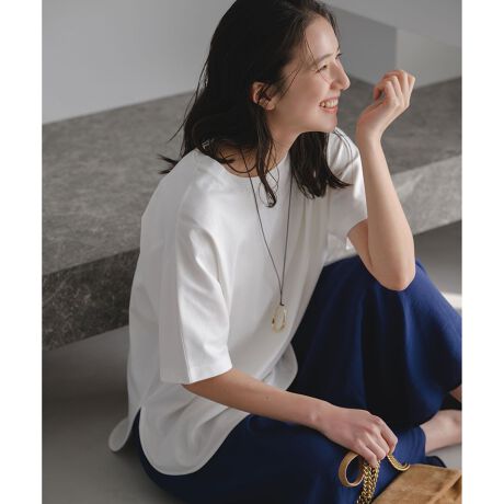 ■デザインこだわりぬいたフォルムで、美しいシルエットに。シンプル見えながら夏に嬉しい汗ジミ機能付きで、暑い日も汗ジミを気にせずオシャレを楽しめるTシャツです。袖に切り替えがないシームレスなデザインで、デコルテから肩にかけて綺麗に見せてくれます。裾は前後差のあるシャツテールで、合わせるボトムスを選びません。少し長めの袖丈で、二の腕もすっきり見えを叶えます。