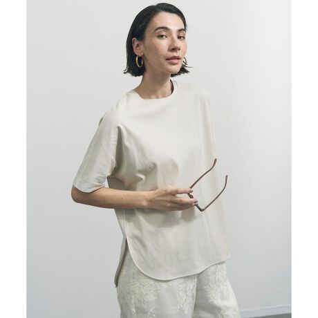 ■デザインこだわりぬいたフォルムで、美しいシルエットに。シンプル見えながら夏に嬉しい汗ジミ機能付きで、暑い日も汗ジミを気にせずオシャレを楽しめるTシャツです。袖に切り替えがないシームレスなデザインで、デコルテから肩にかけて綺麗に見せてくれます。裾は前後差のあるシャツテールで、合わせるボトムスを選びません。少し長めの袖丈で、二の腕もすっきり見えを叶えます。