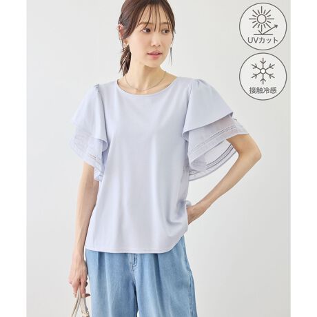 ・袖部分には程よい透け感とはしごレースを配した、柔らかなシアー素材。