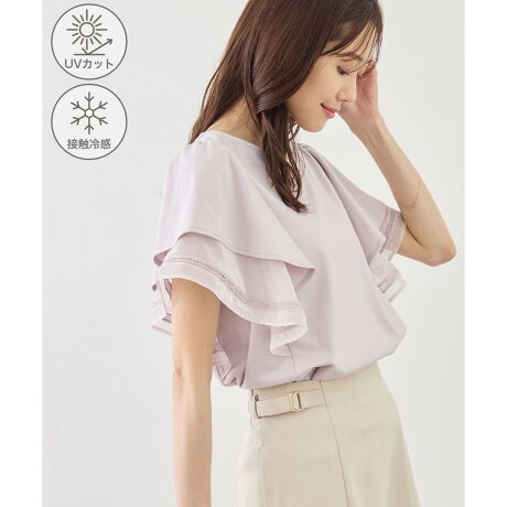 ・袖部分には程よい透け感とはしごレースを配した、柔らかなシアー素材。
