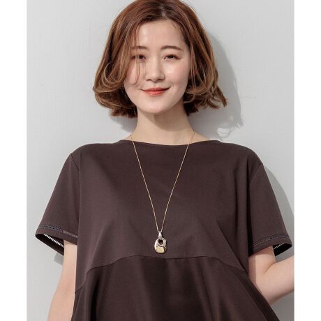ゴールドの雫型メタルトップにシルバーのリングを重ねたネックレスです。上品な輝きを放つゴールドとクールな印象のシルバーが美しく調和し、シンプルでありながらも存在感のある仕上がりになっています。やや長めの華奢なチェーンが縦のラインを強調しすっきりとした印象を与えてくれます。シンプルな無地のニットや襟元が開いたブラウスなどに合わせるだけで、洗練された大人のスタイリングが完成します。日常のカジュアルなコーディネートにはもちろん、オフィススタイルやちょっとしたお出かけなどさりげなく個性を演出したいシーンにも幅広く映える頼れるアイテムです。カラーはどんなお洋服にも合わせやすく程よいアクセントになるゴールド(#090)1色展開です。