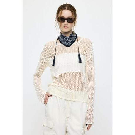 【BOAT NECK MESH KNIT TOP/ボートネック メッシュ ニットトップス】■ポイント透け感のあるメッシュニットトップス。ボートネックとバックスタイルが抜け感を演出し、シンプルながらも印象的な一枚に仕上げています。■ディテール軽やかなメッシュ編みで通気性が良く、ロングシーズン着用可能。バックが空いているデザインで、さりげない肌見せと奥行きのあるシルエットを実現。リラックス感のある着心地も魅力です。ロングスリーブで日除けとしても活躍。■スタイリングキャミソールやチューブトップとのレイヤードがおすすめ。デニムやスラックスと合わせるだけで、抜け感のある大人カジュアルなスタイリングが完成します。■商品のお気に入り登録お気に入りアイテムの再入荷・在庫1点などの通知を受け取ることができます。■ブランドのお気に入り登録新作アイテムの入荷や人気アイテムの再入荷、おすすめトピックスなど、いち早くブランドの情報を受け取ることができます。[注意事項]※画像の商品はサンプルです。実際の商品と仕様、加工が若干異なる場合があります。※画像の商品は光の照射や角度、お使いのモニター環境により、実物と色味が異なる場合がございます。※着用、お取り扱いの際は、アテンションタグをご確認ください。