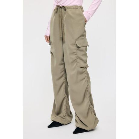 【SATIN CARGO PT/サテンカーゴパンツ】■ポイントサテン素材で仕上げた、上品な印象のカーゴパンツ。ミリタリー由来のデザインを、女性らしく洗練されたバランスにアップデートしました。■ディテール落ち感のあるさらっとした素材で、軽やかな履き心地を実現。程よい光沢がカジュアルになりすぎず、大人っぽいムードを演出します。■スタイリングコンパクトトップスと合わせてメリハリのあるシルエットに。ヒールや華奢なサンダルを合わせれば、都会的なミックススタイルが完成します。