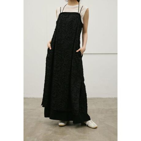 モデル身長164cm(Mサイズ着用)華やかで奥行きのある花柄ジャガードレースを主役にしたキャミソールワンピース。存在感のある素材に、軽やかな別布をレイヤードすることで、歩くたびに内側の生地がさりげなく現れ、スタイリングに動きと奥行きを与えます。胸元にはタックを施し、ミニマルな中に立体的なニュアンスをプラス。裾にかけて広がるボリュームシルエットが、静かな存在感と女性らしさを引き立てます。肩紐調節可能。透け感なし、ストレッチなし。【お手入れ方法】ドライクリーニング