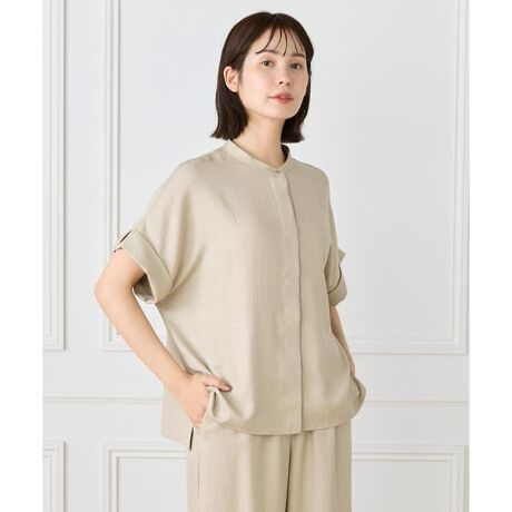 ■デザインリラックス感のあるシルエットに、折り返しデザインのワイドスリーブでポイントを添えたブラウス。すっきりとした比翼仕立ての前あきに、上品なメタル釦が映えるノーブルなスタンドカラーが洗練された印象を演出します。スリット入りのヘムラインで軽やかさもプラスした一枚です。■素材スラブ混の清涼感ある麻調のツイル素材に、小松マテーレ(株)独自のSY加工を施し、膨らみのある軽やかな風合いとナチュラル感を持たせました。また、光沢加工をする事で高級感のある素材に仕上がっています。麻の様なナチュラルな表面感がありながらも、上品な光沢と滑らかな落ち感を併せ持った素材です。シワになりにくいイージーケア性もポイントです。・水洗い可同素材のワンピース品番:7062121030同素材のパンツ品番:7062161029■サンプル撮影商品画像の商品はサンプルです。実際の商品とはサイズや色味、素材、デザイン等の仕様が若干変更になる場合がございます。■カラーについては、可能な限り実際の商品に近いカラーにて撮影をおこなっておりますが、照明の関係により実際の製品とは色味が違って見える場合があります。またパソコン・スマートフォンなどの環境により、若干製品と画像のカラーが異なる場合もございます。現物と画像のカラー差異については返品理由となりませんので、予めご了承ください。■サイズ表記はあくまで目安となります。