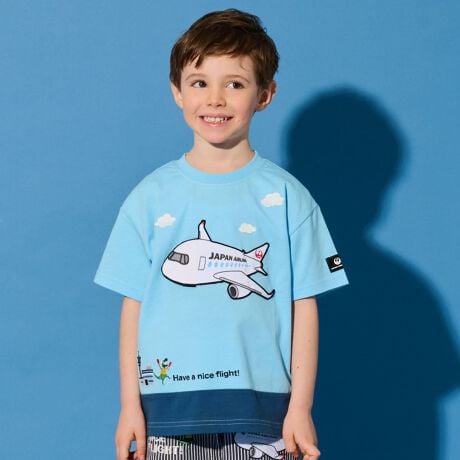 JALが運航するAIRBUS A350型機のアップリケが目を引くTシャツです。