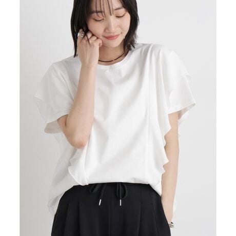 ふんだんにあしらったフレアデザインが華やかに映える、異素材コンビのカットトップス。軽やかなラッフルが立体感を生み、シンプルながらも着映えするアイテムです。