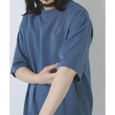 接触冷感と吸水速乾機能を備えたクールタッチ素材で、ひんやりとした快適な着心地が魅力。さらっとしたドライな質感で、汗ばむ季節でもベタつきにくく心地よく着用できます。クレープジョーゼット特有の落ち感と上品な表面感が、Tシャツながらカジュアルすぎない印象に。体のラインを拾いにくいシルエットで、リラックス感ときちんと見えを両立し、オンオフ問わず活躍する一枚です。