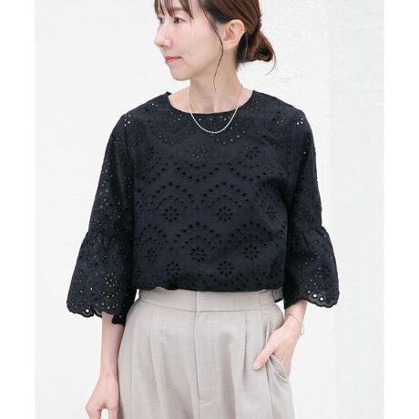 繊細なレース素材を贅沢に使用したブラウスは、着るだけで華やかな印象を演出してくれる一枚。スカラップデザインの袖が軽やかな動きを生み、女性らしさを引き立てながらも、甘くなりすぎない上品なバランスに仕上がっています。ゆとりのあるシルエットで体のラインを拾いにくく、リラックスした着心地も魅力。バックボタン仕様で後ろ姿まで抜かりなく、オンオフ問わず幅広いシーンで活躍します。大人のスタイリングに華やぎを添える一枚です。