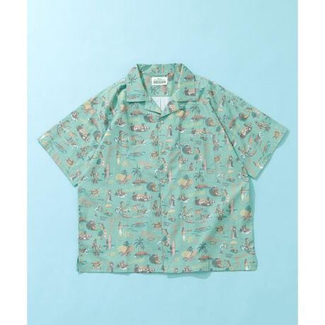 遊び心あふれるイラストが全体に広がる開襟トップスで春から初夏のリゾートシーンに映える一着です。