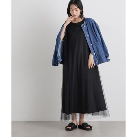 一枚でスタイリングが完成する、チュールコンビのレイヤード風ワンピース。透け感のあるチュールが華やかさと女性らしさを引き立て、動くたびに軽やかな印象を演出します。きれいめからカジュアルまで幅広いシーンに対応できる万能な一枚です。
