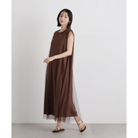 一枚でスタイリングが完成する、チュールコンビのレイヤード風ワンピース。透け感のあるチュールが華やかさと女性らしさを引き立て、動くたびに軽やかな印象を演出します。きれいめからカジュアルまで幅広いシーンに対応できる万能な一枚です。