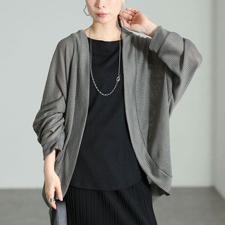 大人気ニュアンスカーデ新作登場☆透かし編みドルマンカーディガン体型を拾わないゆったり身幅&袖幅でゆとりのあるリラクシーな着心地◎お尻がすっぽり隠れる長め着丈で気になるヒップ&腰まわりをカバーしてくれます。前上がりのラウンド裾で脚を長く見せスタイルアップ効果も抜群♪スカートにもパンツにも合うデザインでコーデに取り入れやすい着回し力抜群の一着です☆