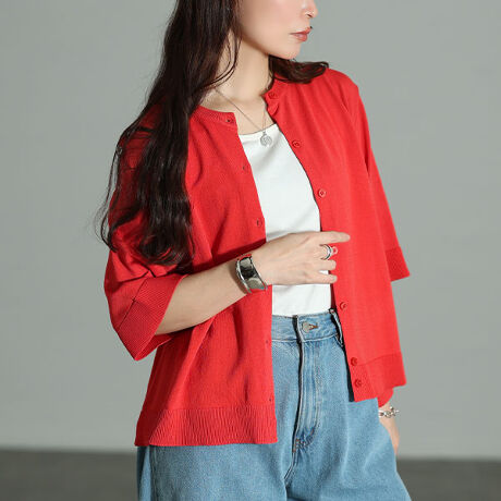 ベーシックなニットカーディガンは、着回し力の高さが嬉しいアイテム。シンプルだからこそ、スタイリングやシーンを選ばず着用できるのがポイント。シャリ感とさらっとした肌触りのサマーニット生地で夏にぴったり。カジュアルながらも綺麗めな印象漂う大人なカーディガン。モタつきなく、コンパクトなシルエットですっきりとした印象が漂いながらも、ゆとりのある身幅設定と、安心の5分袖で気になる部分を体型カバー。長過ぎず、短過ぎない絶妙な丈感で全体のバランスを整え、脚長効果を発揮。袖口や裾をリブに切り替えることでヨレを防止します。
