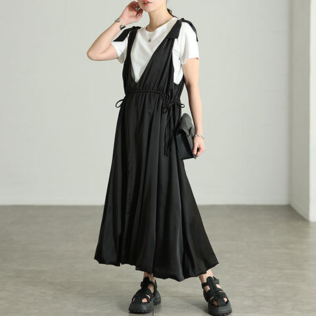 バルーンシルエットのワンピースは、カジュアルにも綺麗めにも馴染む、万能さが嬉しい一着。結ばれた肩紐がリボン風デザインに仕上がり、さり気なくガーリーな印象をプラス。光沢感を放つ品の良いテクスチャーで、カジュアルながらも大人っぽさが漂います。ゆったりとしたアームホールでインナーを選ばず、レイヤードを楽しめるワンピース。深めのVネックが顔周りをすっきりさせ、トレンド感を演出。高めのドロスト位置で脚長効果に。落ち感のあるバルーンが上品に広がり、下半身をすっきりカバーしながら美しいシルエットに。