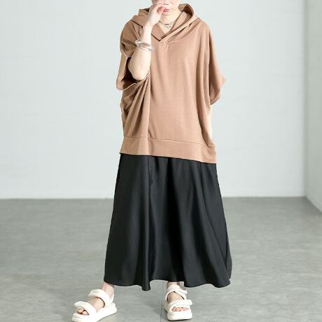 大人気シリーズ、ドッキングワンピースの新作が登場!ゆったり着れて着痩せ効果も抜群のドルマンパーカードッキングワンピース。肩周り&二の腕をしっかりカバー。身幅もゆったりで体型を拾わない。スカートは光沢感のあるサテン生地で、ラフさの中にも上質感もあります。全体的にゆったりしたサイズ+Aラインシルエットで体型カバーも抜群。シンプルすぎない大きめフードやバイカラー使いもおしゃれ度をアップ。お家時間、デイリー、旅行などカジュアルなシーンで活躍してくれます。