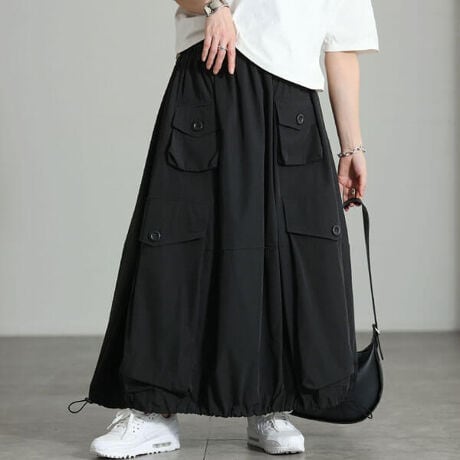 魅せる黒☆裾ドロストビッグポケットスカート贅沢に生地を使用した立体感のあるボリュームシルエットでぽっこりお腹・脚のライン&ヒップをまるッとお洒落にカバー◎裾のドロストを調整するだけで今人気のバルーンシルエットに早変わり!他にはないビッグポケットデザインでモードな印象に◎シンプルな黒なのでどんなトップスとも合わせやすくコーデに取り入れやすい♪