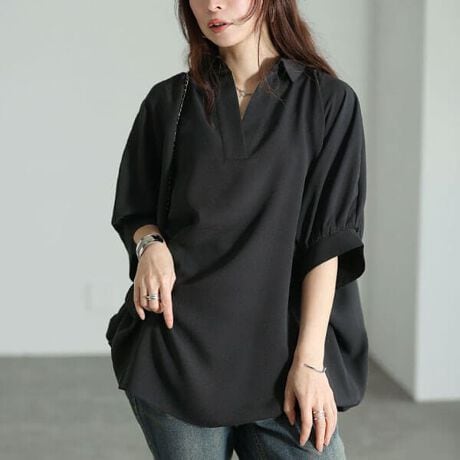 テクなしで綺麗見え、接触冷感スキッパードルマンシャツチュニック。ぽっちゃりさんに人気の長めドルマンシルエットでお洒落に体型カバー◎ぽわん袖で二の腕をカバーしながら通常より広めの袖口幅で華奢感をプラス☆シンプルな綺麗めデザインなのでオンオフどちらも着まわしていただけます♪汗ばむ季節に活躍する接触冷感素材◎