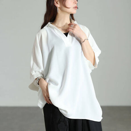 テクなしで綺麗見え、接触冷感スキッパードルマンシャツチュニック。ぽっちゃりさんに人気の長めドルマンシルエットでお洒落に体型カバー◎ぽわん袖で二の腕をカバーしながら通常より広めの袖口幅で華奢感をプラス☆シンプルな綺麗めデザインなのでオンオフどちらも着まわしていただけます♪汗ばむ季節に活躍する接触冷感素材◎