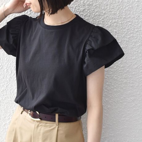 シンプルながら、一枚で映えるフリルスリーブのカットソー。