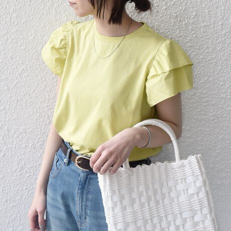 シンプルながら、一枚で映えるフリルスリーブのカットソー。