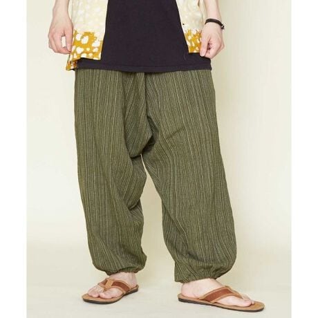 [型番:TLG-6601-2026]自然と調和するカラーリング。タイコットン100%のサルエルパンツ。主張しすぎないさり気ないストライプ柄がアクセントに。左右にポケットが付き、ウエストはゴムと紐でサイズ調整が可能。裾にもゴムが入りシルエットや丈を変えられます。