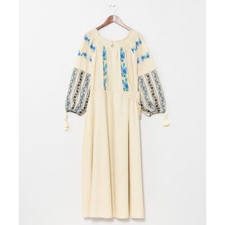 [型番:LIA-6202-2026]ウクライナの伝統刺しゅう・ヴィシヴァンカをモチーフに、魔除けの象徴とされる芥子(けし)の実など、意味を持つモチーフを繊細に描いたワンピース。ギャザーを寄せた襟まわりが顔まわりを華やかに見せ、ふんわり袖のシルエットが民族調の趣を演出。軽やかに纏える一着です。