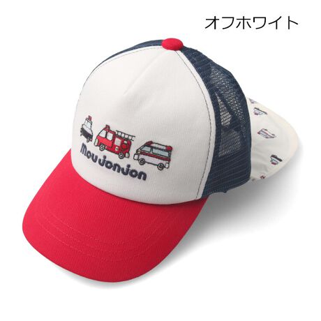 働く車の刺繍入りメッシュキャップ、帽子。マジックテープで取り外し出来る保冷剤ポケット付きの日よけのたれ付き。日よけには働く車の総柄プリント入り。【アイテム】雑貨 カジュアル お洒落 オシャレ かっこいい かわいい 可愛い 普段着 デイリーウェア お出かけ 子ども こども 男児 男の子 ボーイズ キッズ ベビーサイズ トドラーサイズ 幼稚園 保育園 小学校 通園 通学 小学生 遠足 旅行 2026年春夏物新作 丸高衣料 小物 働く車 消防車 パトカー 救急車 オフホワイト 白色 ネイビー 紺色 ムージョンジョン