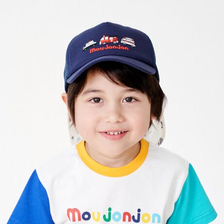 働く車の刺繍入りメッシュキャップ、帽子。マジックテープで取り外し出来る保冷剤ポケット付きの日よけのたれ付き。日よけには働く車の総柄プリント入り。【アイテム】雑貨 カジュアル お洒落 オシャレ かっこいい かわいい 可愛い 普段着 デイリーウェア お出かけ 子ども こども 男児 男の子 ボーイズ キッズ ベビーサイズ トドラーサイズ 幼稚園 保育園 小学校 通園 通学 小学生 遠足 旅行 2026年春夏物新作 丸高衣料 小物 働く車 消防車 パトカー 救急車 オフホワイト 白色 ネイビー 紺色 ムージョンジョン