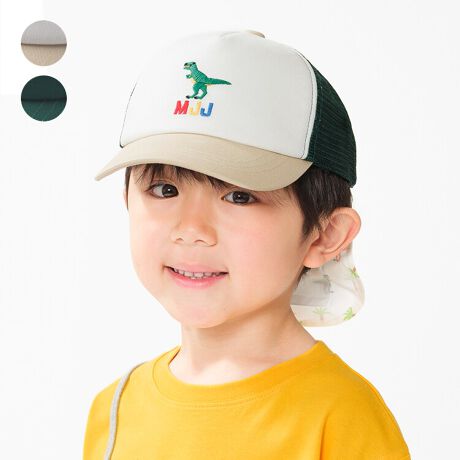 恐竜の刺繍入りメッシュキャップ、帽子。マジックテープで取り外し出来る保冷剤ポケット付きの日よけのたれ付き。日除けには恐竜の総柄プリント入り。【アイテム】雑貨 カジュアル お洒落 オシャレ かっこいい かわいい 可愛い 普段着 デイリーウェア お出かけ 子ども こども 男児 男の子 ボーイズ キッズ ベビーサイズ トドラーサイズ 幼稚園 保育園 小学校 通園 通学 小学生 遠足 旅行 2026年春夏物新作 丸高衣料 小物 ダイナソー オフホワイト 白色 グリーン 緑色 ムージョンジョン