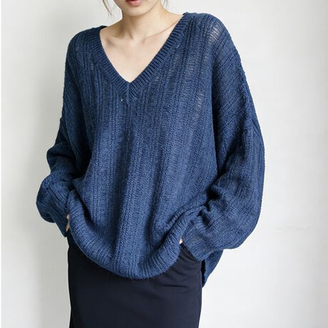 Vネックが顔まわりをすっきり見せる長袖ニットトップス。