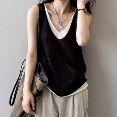 Vネックのすっきりとしたラインが特徴のノースリーブニットトップスです。