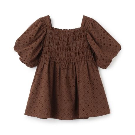 コットンのアイレットレースをたっぷりと使用した上品なチュニックです。袖口に丸みを持たせたパフスリーブが目を引くデザイン。胸元と背中部分はシャーリング仕様になっており、程よいフィット感でお着替えもラクラクです。デニムパンツやハーフ丈のボトムスを合わせた春夏らしい着こなしを楽しめます。