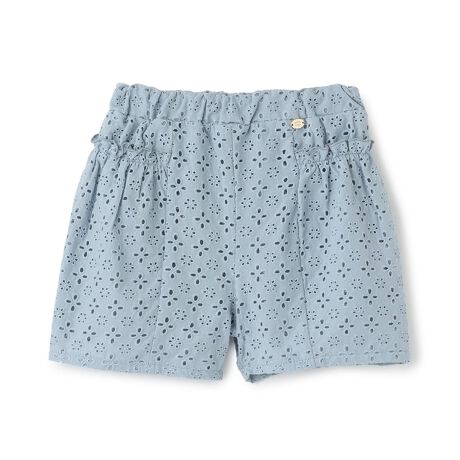 コットンのアイレットレースをたっぷりと使用したショートパンツです。サイドにギャザーを寄せ、華やかなデザインに仕上げました。ハンカチやティッシュを入れられるバックポケットつきなのもうれしいポイント。裏地を全面に備えており、透けを気にせずに着用できます。内側にお名前を記入できるタグつき。【おすすめの着用時期は春夏シーズン】