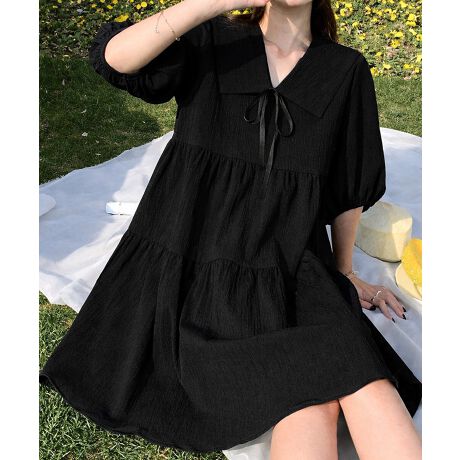 ビッグカラーとリボンが目を引く、ティアードミニワンピース。