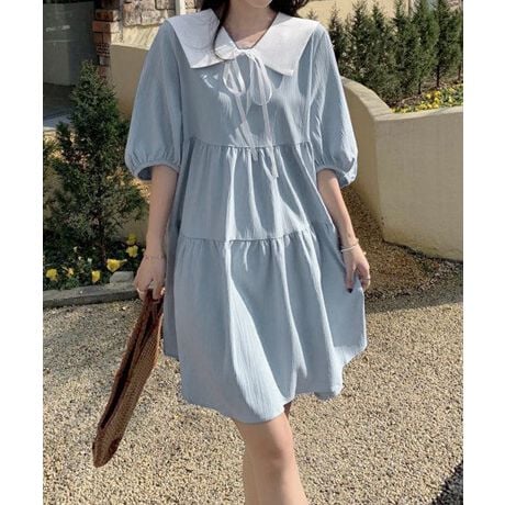 ビッグカラーとリボンが目を引く、ティアードミニワンピース。