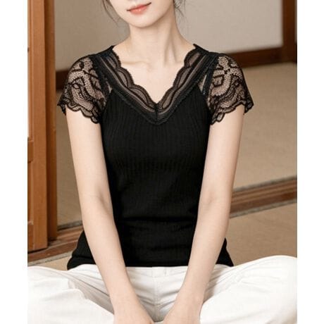 Vネックデザインで、デコルテラインを美しく演出するフレンチスリーブトップス。