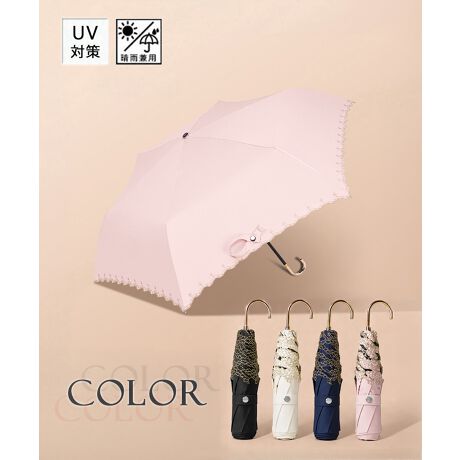 フリルの縁にレース刺しゅうをあしらった、紫外線対策ができる晴雨兼用の日傘。