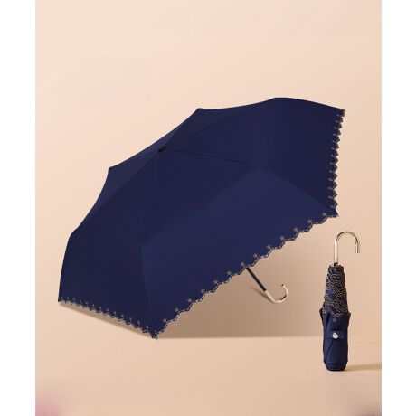 フリルの縁にレース刺しゅうをあしらった、紫外線対策ができる晴雨兼用の日傘。