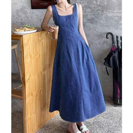 デニム風 ロングワンピース ノースリーブ
